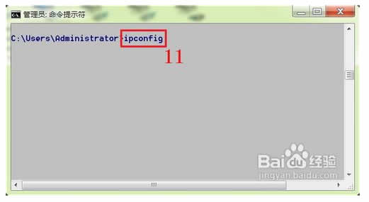 11:另外,也可以通过Win 7操作系统的CMD命令行查看配置的第二个IP地址情况。在“命令提示符”中输入命令“ipconfig”,然后回车如下图所示。